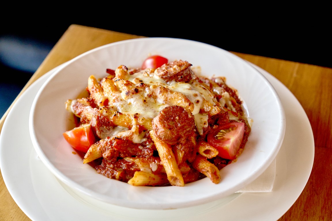 baked with hot italian sausage, smoked bacon, veal bolognese & cheeses
